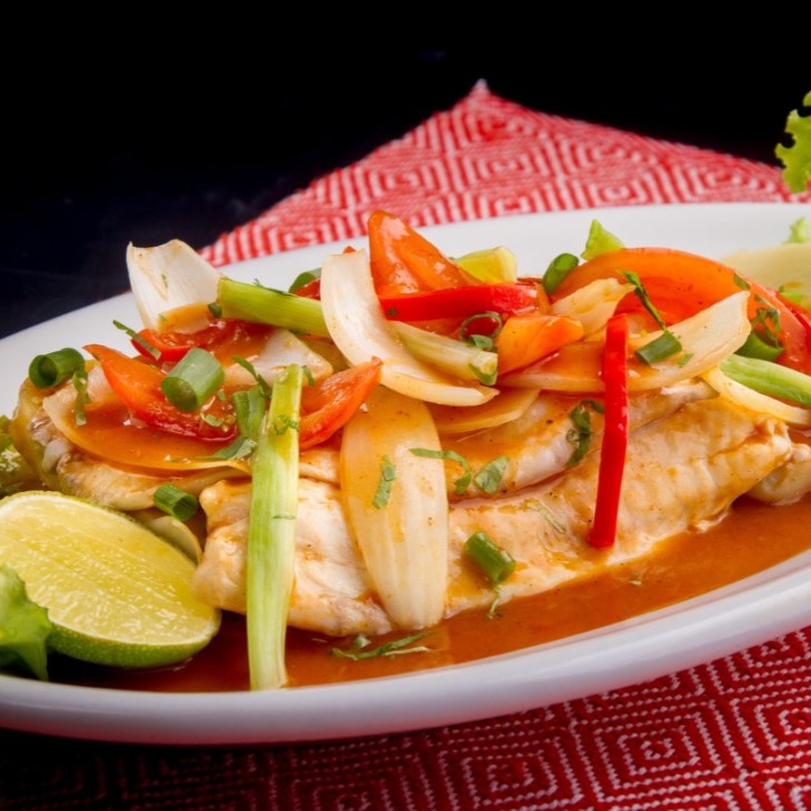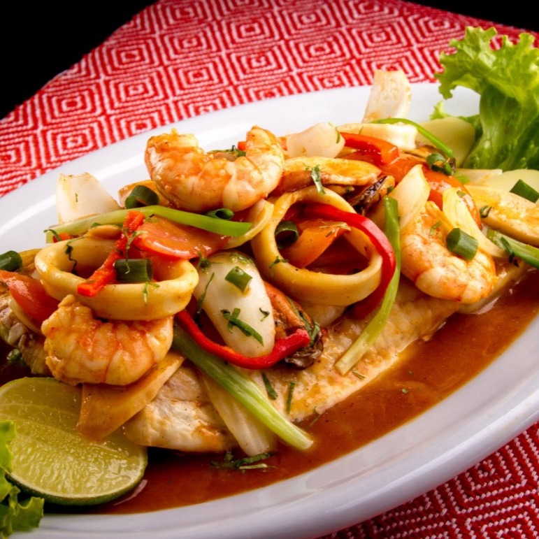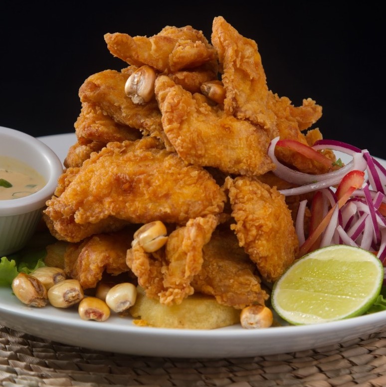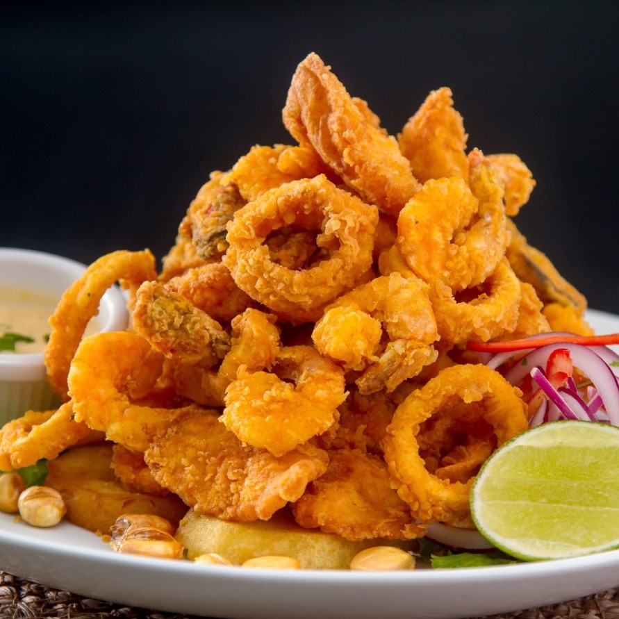 Filé de peixe frito com frutos do mar (polvo, camarão, mexilhões e lula), banhados com cremoso molho de pimentas peruanas (ají amarillo, ají mirasol e ají panca). Acompanha batata dourada, arroz branco, pimenta da casa e maionese.