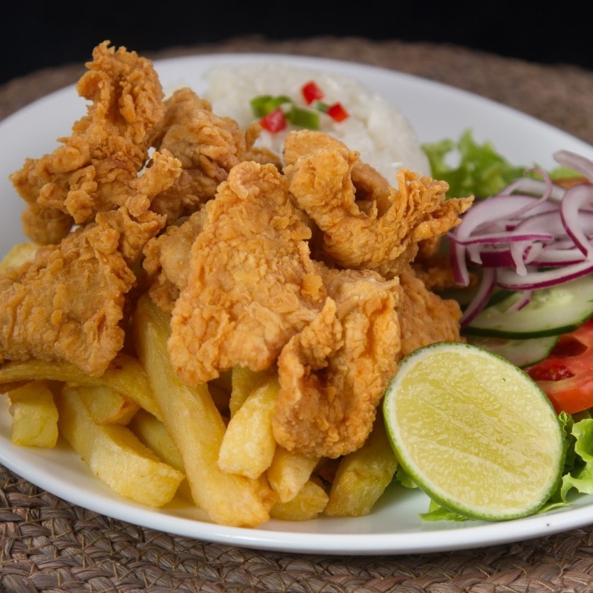 Mix de peixe, camarão, mexilhão e lula empanados; batata dourada e Sarza Criolla peruana (saladinha). Acompanha maionese, molho tártaro e pimenta da casa.