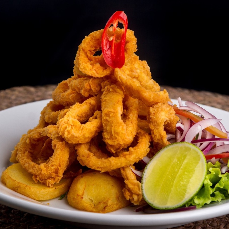 Rodelas de lula empanada crocante, batata dourada e Sarza Criolla peruana (saladinha). Acompanha maionese, molho tártaro e pimenta da casa.