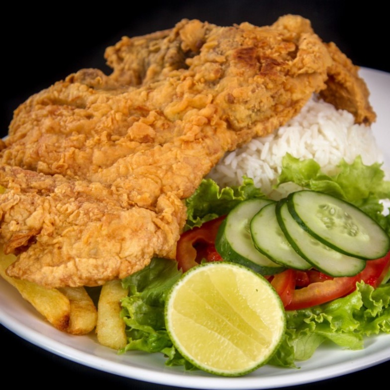 Peça de frango empanado crocante, batata frita, arroz e salada (pepino, tomate, alface e limão). Acompanha pimenta da casa e maionese.