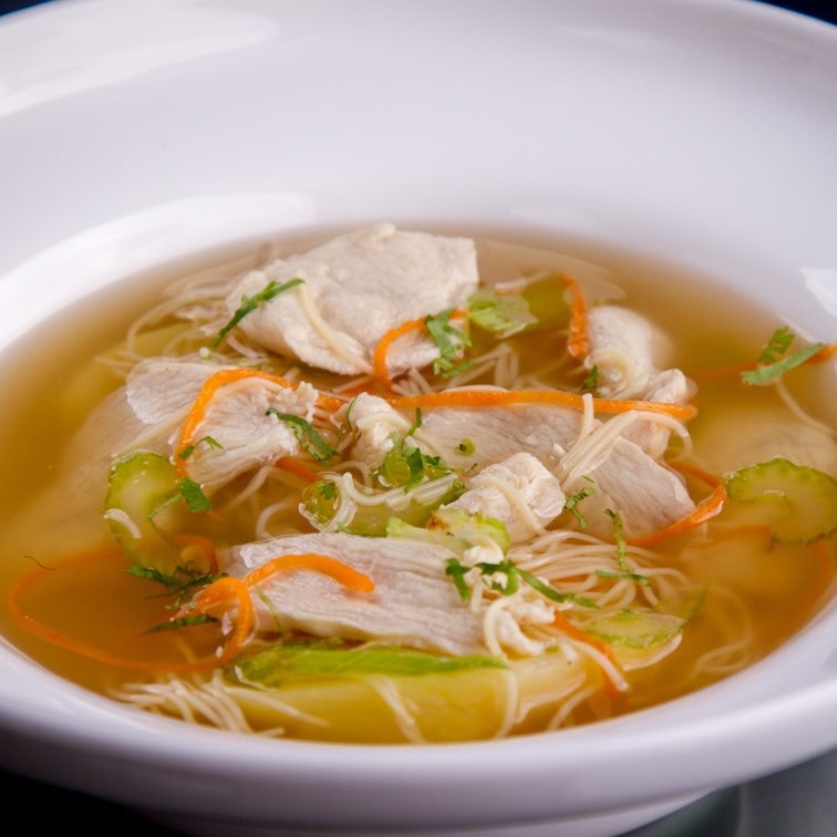 Pedaços de peito de frango, cabelo de anjo, e mix de vegetais.