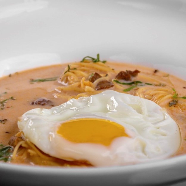 Iscas de carne, cabelo de anjo cozinhados em tempero crioulo (orégano, tomate, cebola, alho, pasta de Ají Panca peruano) e leite. Acompanha ovo frito à inglesa.