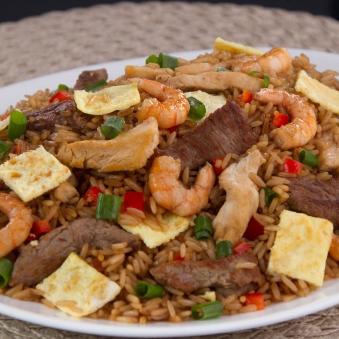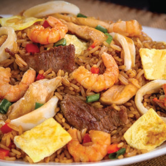 Arroz, carne, frango, camarão, mexilhões, lula, cebolinha, omelete e molho shoyu; Comida Chifa (fusão Peruana-Chinesa). Acompanha pimenta da casa e maionese.
