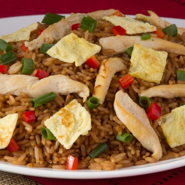 Arroz, frango, cebolinha, omelete e molho shoyu; Comida Chifa (fusão Peruana-Chinesa). Acompanha pimenta da casa e maionese.