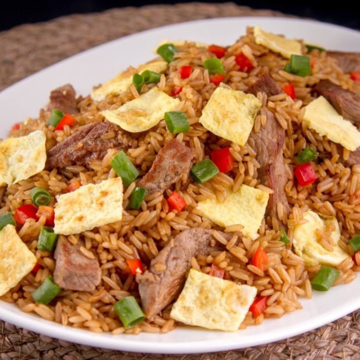 Arroz, carne, cebolinha, omelete e molho shoyu; Comida Chifa (fusão Peruana-Chinesa). Acompanha pimenta da casa e maionese.