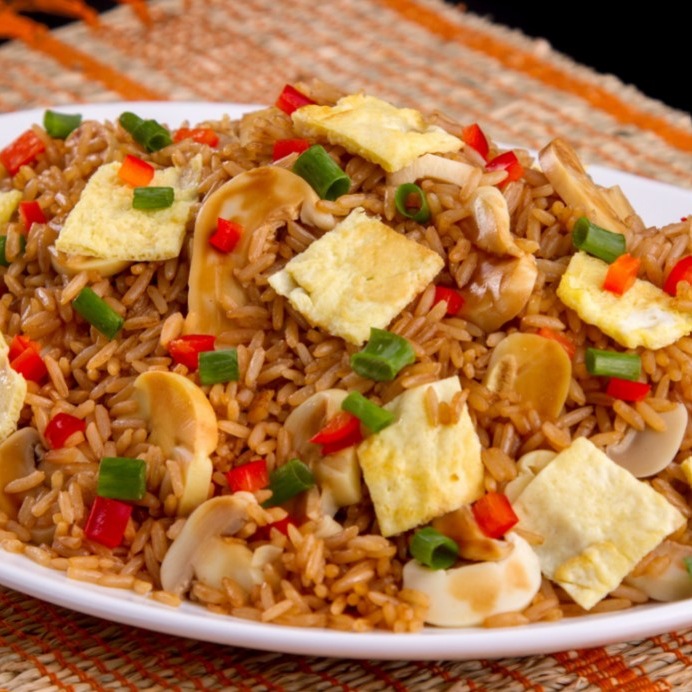 Arroz, abundantes champinhons, pimentão vermelho, cebolinha, omelete e molho shoyu; Comida Chifa (fusão Peruana-Chinesa). Acompanha pimenta da casa e maionese.