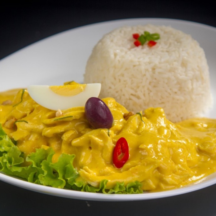 Peito de frango desafiado envolvido em creme de Ají Amarillo peruano (ligeiramente apimentado). Acompanha arroz branco, ovo cozido, batata cozida, alface e azeitona.
