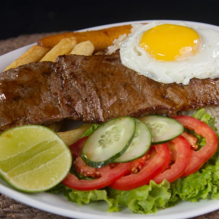Bisteca bovina, batata frita, salada (alface, tomate, pepino e limão). Acompanha banana da terra frita, ovo frito à inglesa, arroz branco, pimenta da casa e maionese.