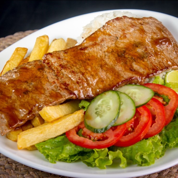 Bisteca bovina, batata frita, salada (alface, tomate, pepino e limão). Acompanha arroz branco, pimenta da casa e maionese.