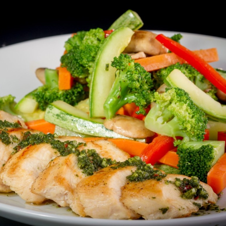 Escalopes de frango e legumes grelhados (cogumelos, brócolis, zucchini, cenoura e pimentão vermelho). Acompanha maionese, pimenta e chimichurri da casa.