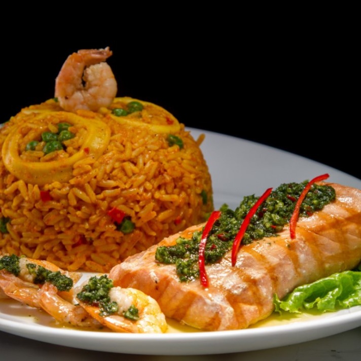 Filé de salmão e camarões grelhados servidos com arroz marinho (lula e mexilhões). Acompanha maionese pimenta e chimichurri da casa.