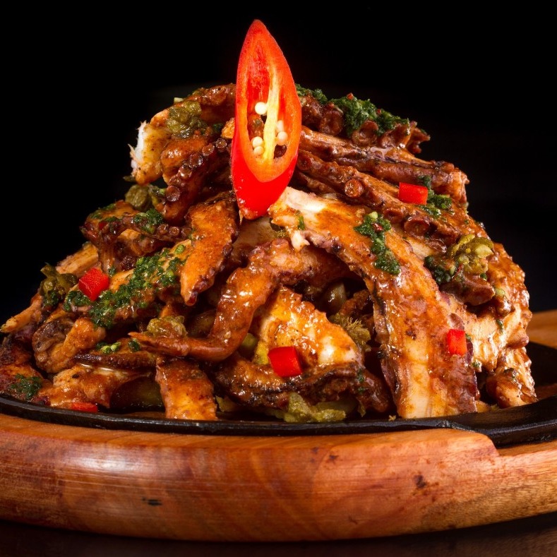 Polvo grelhado, banhado em Molho Anticuchero com ligeiro toque apimentado. Acompanha cubos de batata crocante, Ají Anticuchero (maionese picante) e chimichurri da casa.