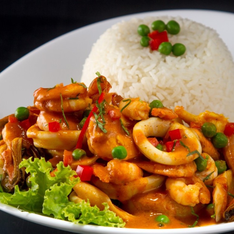 Arroz umedecido com temperos clássicos peruanos e abundantes frutos do mar (polvo, camarão, mexilhões e lula). Acompanha Sarza Criolla peruana (saladinha), pimenta da casa e maionese.
