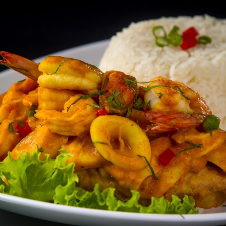 Abundantes frutos do mar (polvo, camarão, mexilhão e lula), banhados com cremoso molho de pimentas peruanas (ají amarillo, ají mirasol e ají panca). Acompanha batata cozida, arroz branco, pimenta da casa e maionese.