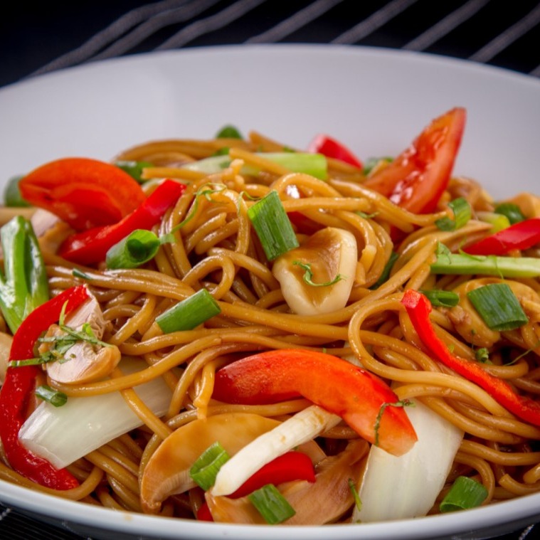 Iscas de frango, espaguete, cebola, pimentão vermelho, tomate, cebolinha salteados em molho shoyu. Acompanha pimenta da casa e maionese.