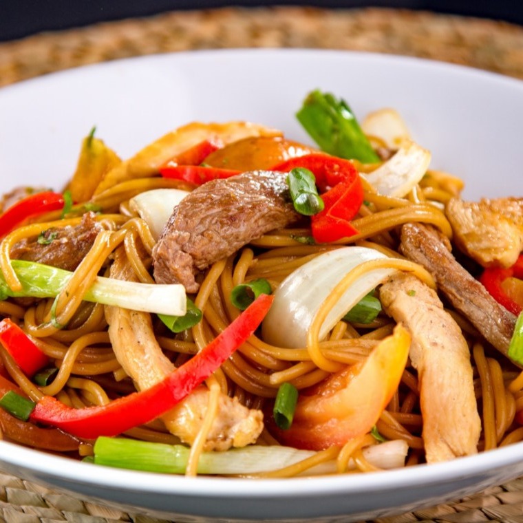 Iscas de carne e frango, espaguete, cebola, pimentão vermelho, tomate, cebolinha salteados em molho shoyu. Acompanha pimenta da casa e maionese.