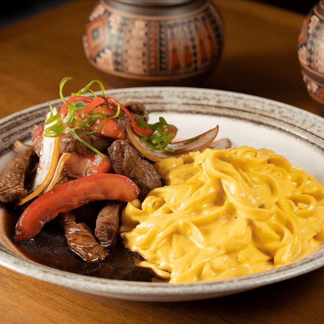 Prato Italo Peruano com fettuccini em salsa Huancaína (molho cremoso amarelo, levemente picante). Acompanha Lomo Saltado, pimenta da casa e maionese (à parte).