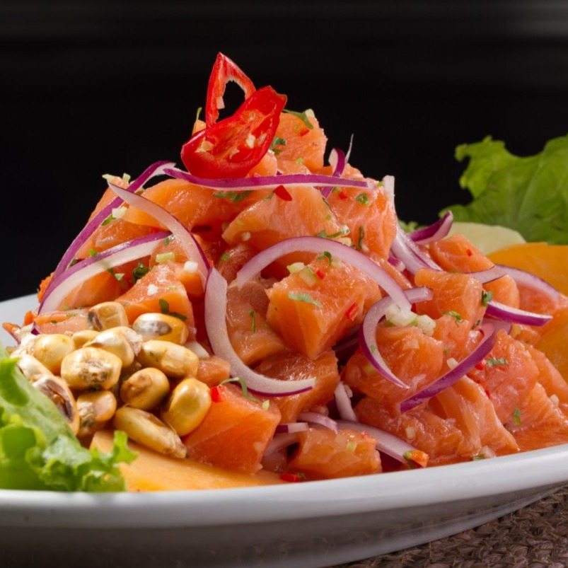 Cubos de salmão marinados em sumo de limão, coentro, cebola roxa, e leche de tigre; ligeiramente apimentado. Acompanha batata, batata doce e milho peruano crocante.