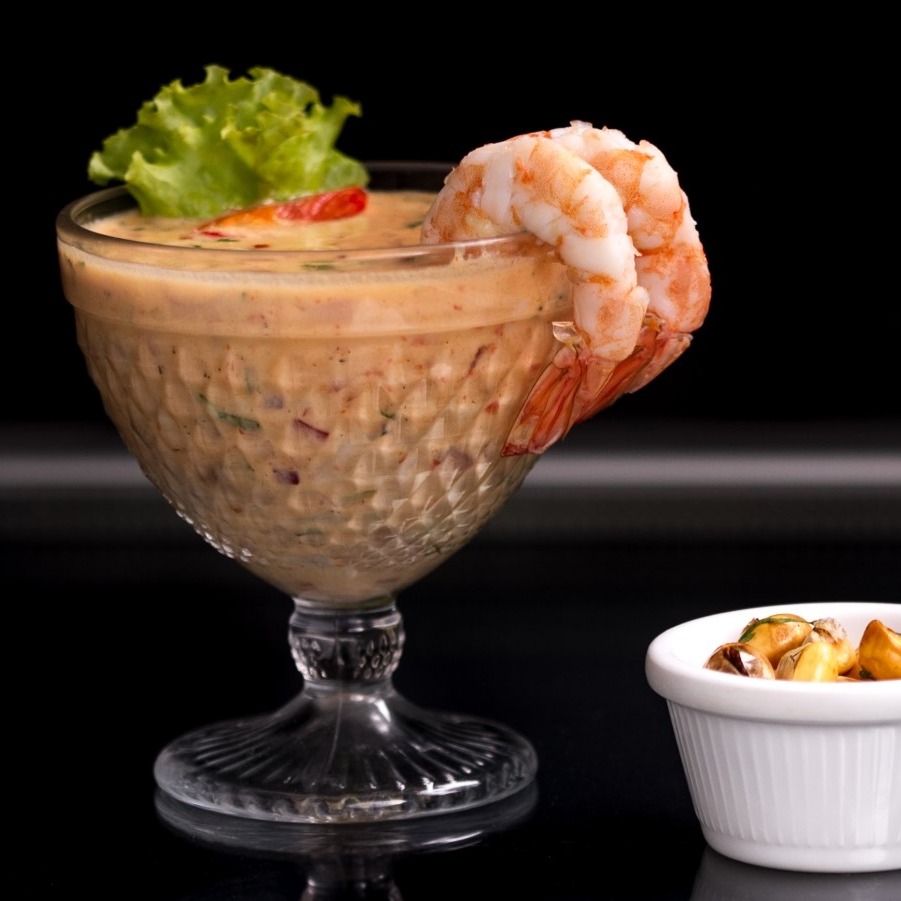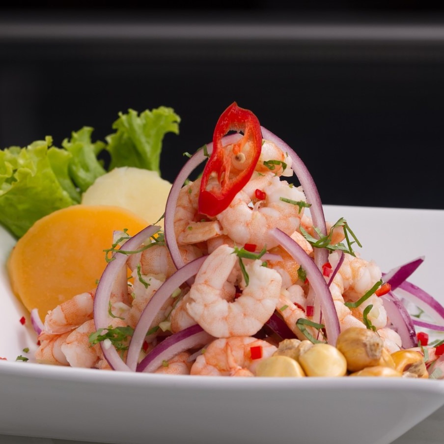 Camarões marinados em sumo de limão, coentro, cebola roxa, e leche de tigre; ligeiramente apimentado. Acompanha batata, batata doce e milho peruano crocante.