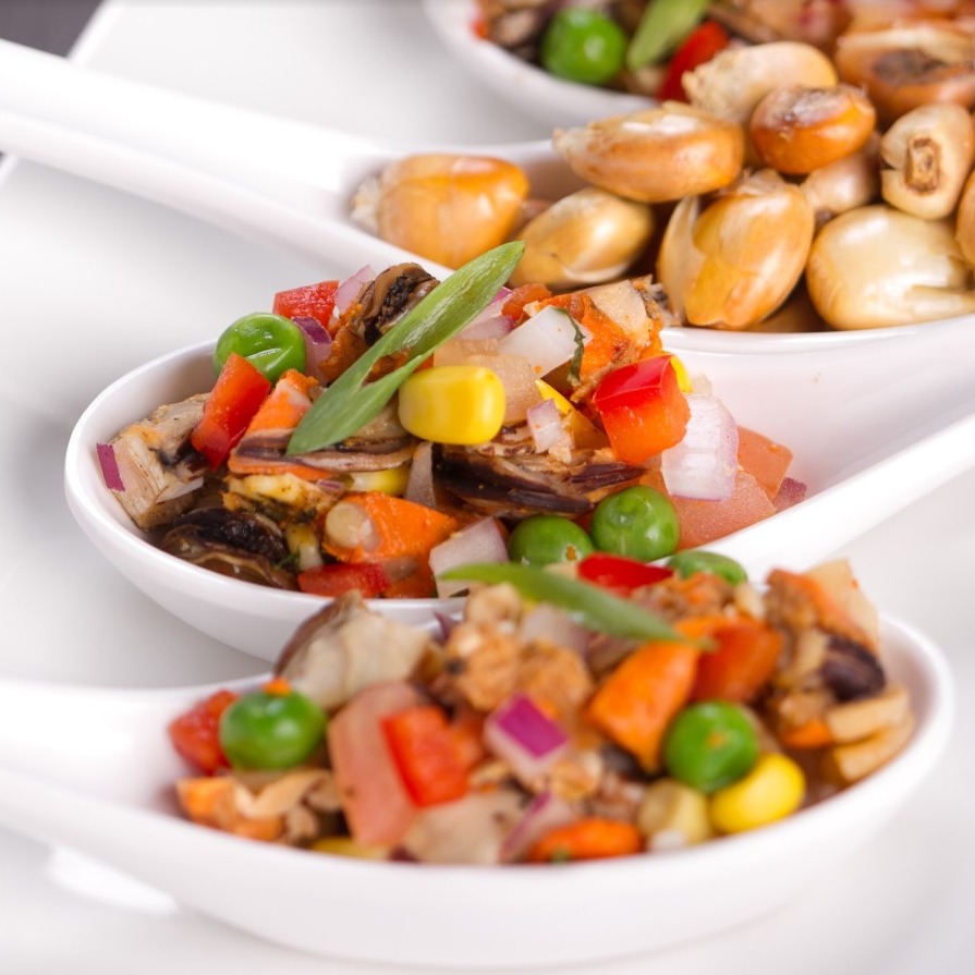 6 porções de mexilhões, cebola, tomate, milho e ervilhas; marinados em sumo de limão. Acompanha milho peruano crocante.