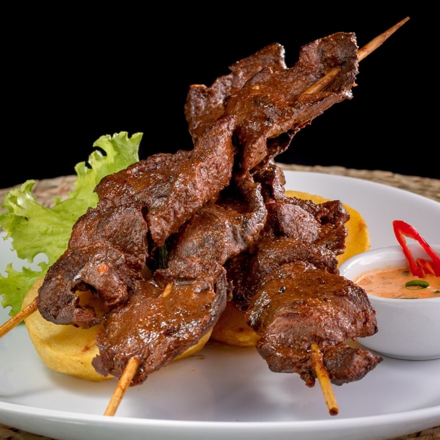 3 espetinhos de coração bovino, marinado com Ají Panca peruano e cerveja. Acompanha Ají Anticuchero (maionese picante) e chimichurri da casa.
