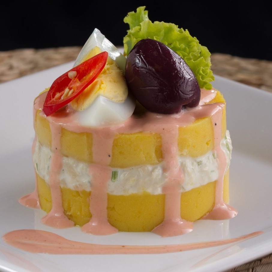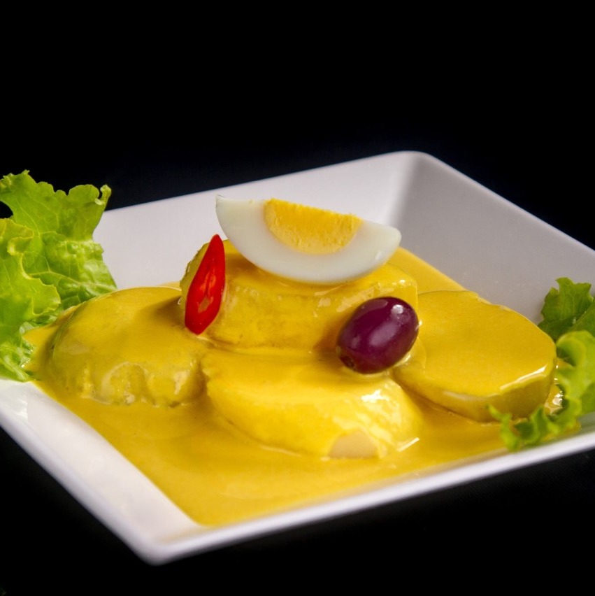 Rodelas de batata banhadas em Creme de Huancaína (molho cremoso tradicional peruano, levemente apimentado). Acompanha azeitona preta, alface e ovo cozido.